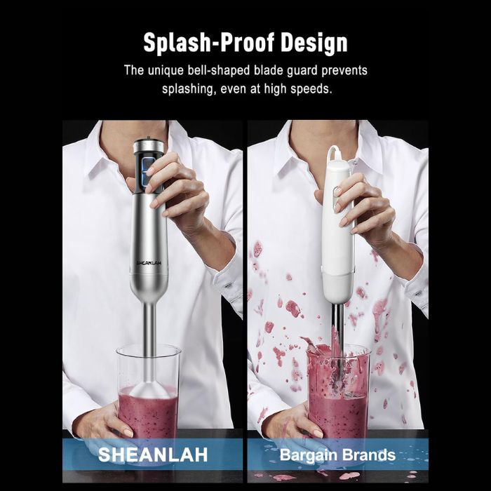 • Our immersion blender features a unique bell-shaped blade guard that prevents splashing and protects your containers from scratches, keeping your kitchen clean and your cookware looking new.